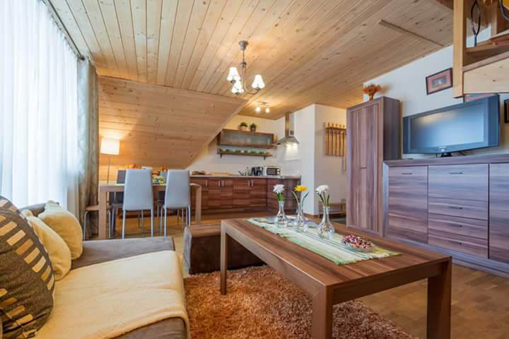 Byt POD-SMERKIEM - Bezpochyby je to ideální horský apartmán v rustikálním stylu, 6 km od Zakopane - ideální pro rodiče s dětmi. Dřevěné podlahy a stěny, ostré šikmé hrany (účinek blahodárných a regeneračních vlastností pyramidy), schody spojující dvě velmi prostorná patra a nakonec skvělý výhled na Západní Tatry. Nedaleko se nacházejí sjezdovky s lyžařskými vleky a termálními bazény Chochołowskie Termy a bazény na Szymoszkowě.