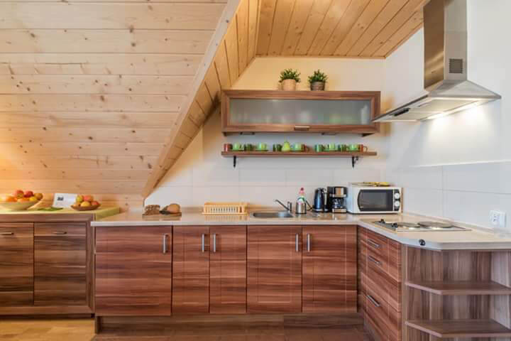 lednička s mrazákem, rychlovarná konvice bezdrátová, mikrovlnná trouba, dvouplotýnkový vařič, toustovač s funkcí grilu, nádobí, hrnce, příbory, kávovar