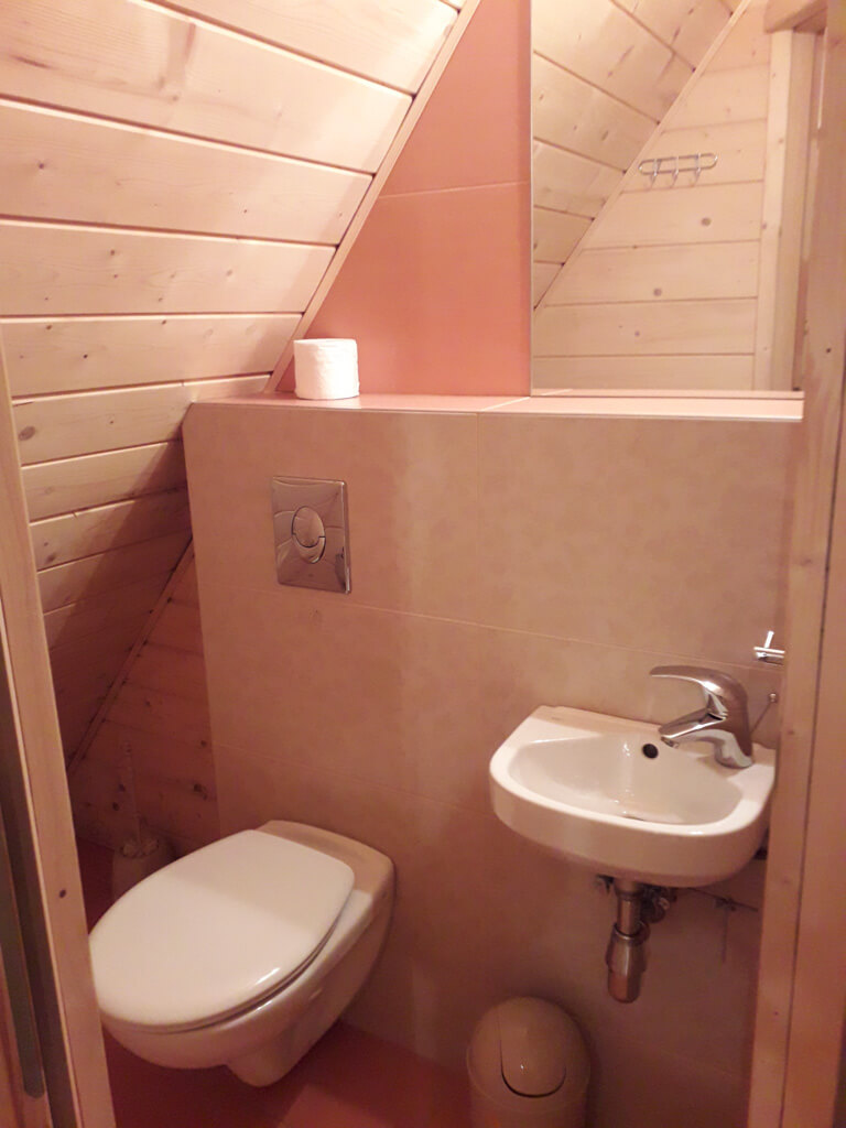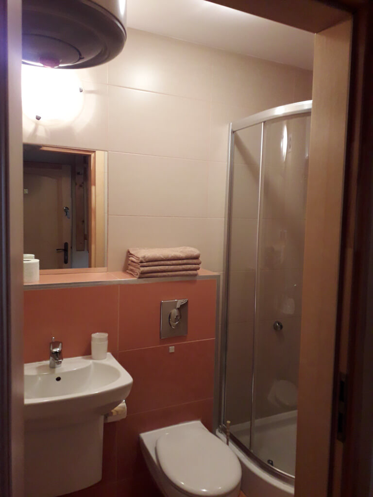 sprchový kout, umyvadlo, WC, vysoušeč vlasů, ručníky, podlahové vytápění